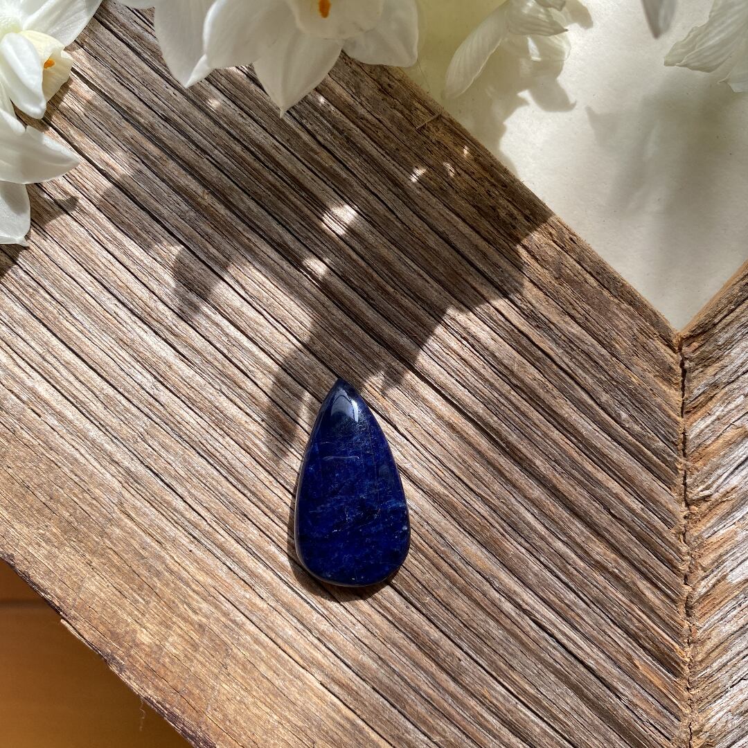 ディープブルーの色合いが上品なソーダライト、裏を見ると特有の赤色も。