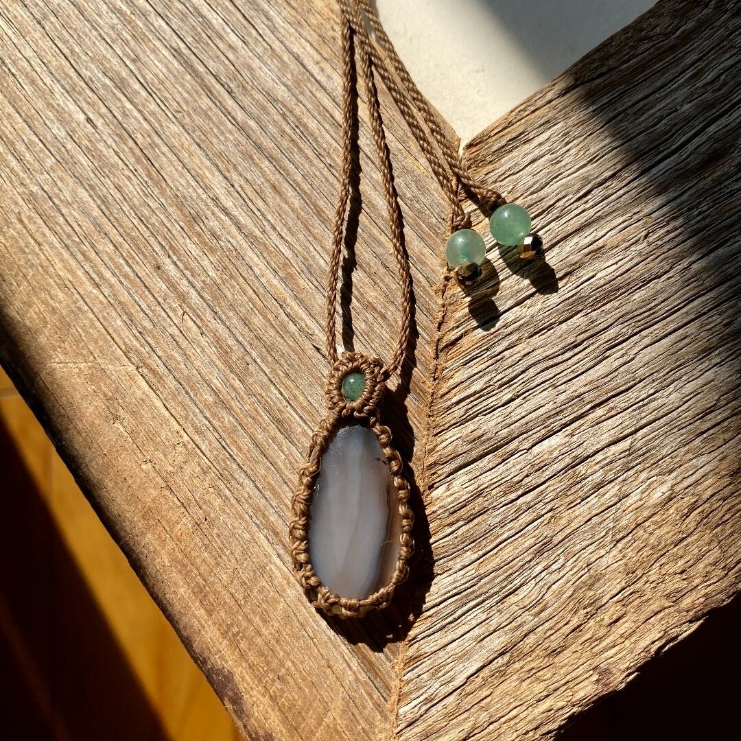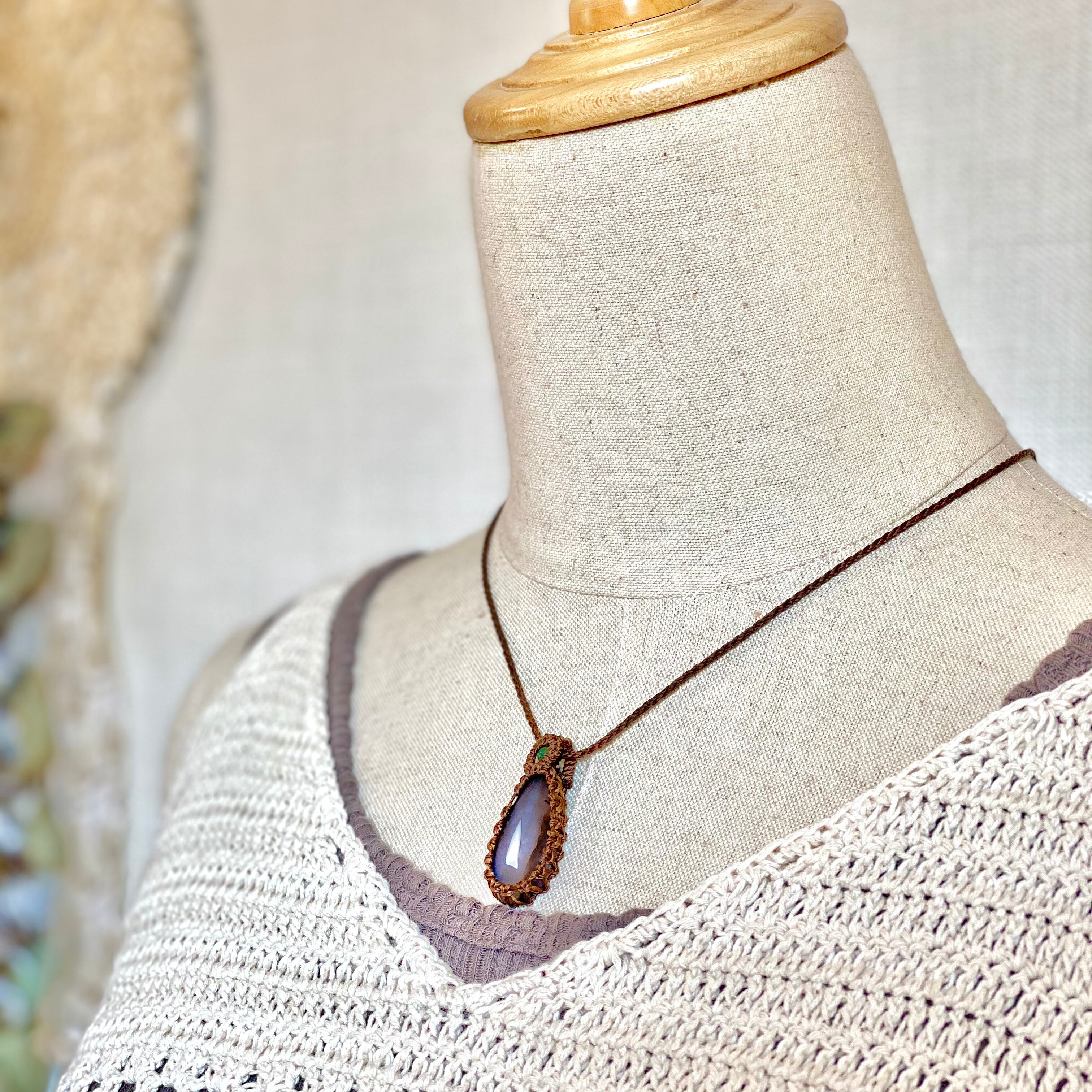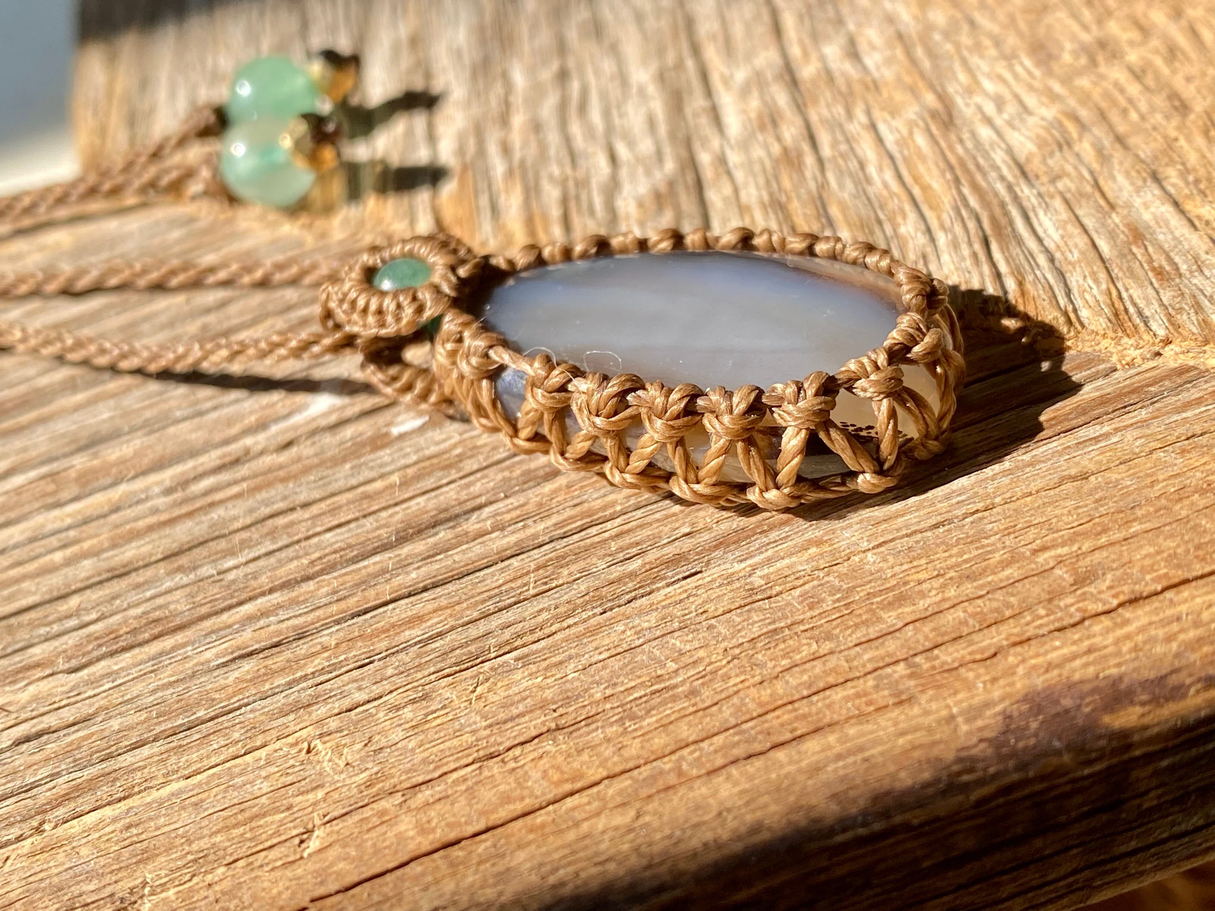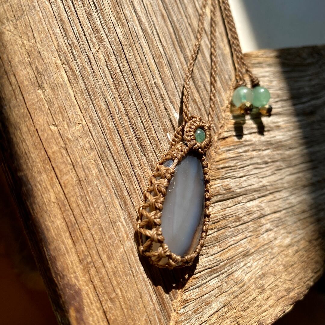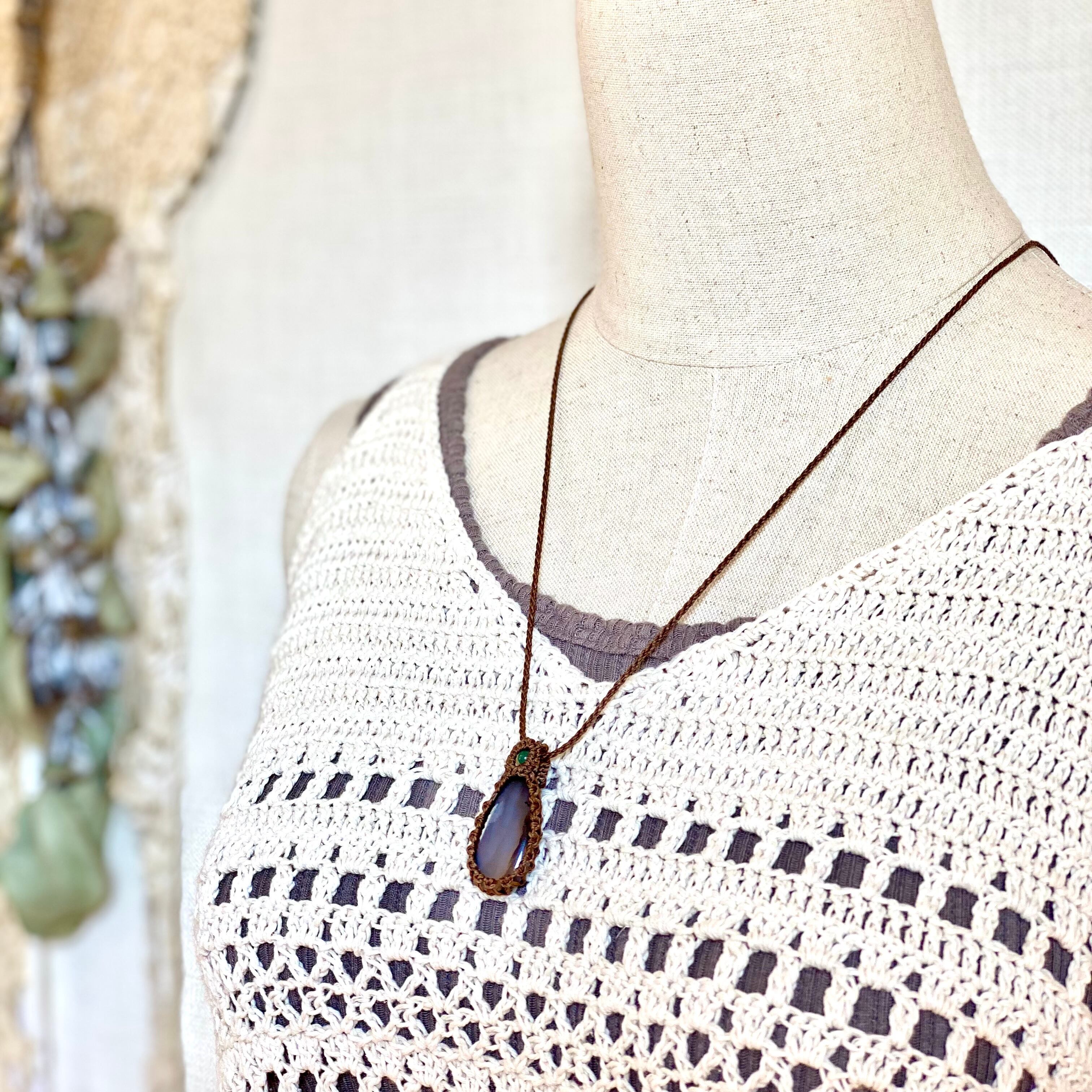 一般的なアゲートに比べさわやかでアートな印象、ブラウンの糸で透け感のあるフレームを作り、ポイントでまあるいバチカンの中とエンドにグリーンアベンチェリン、タイガーアイをプラス。