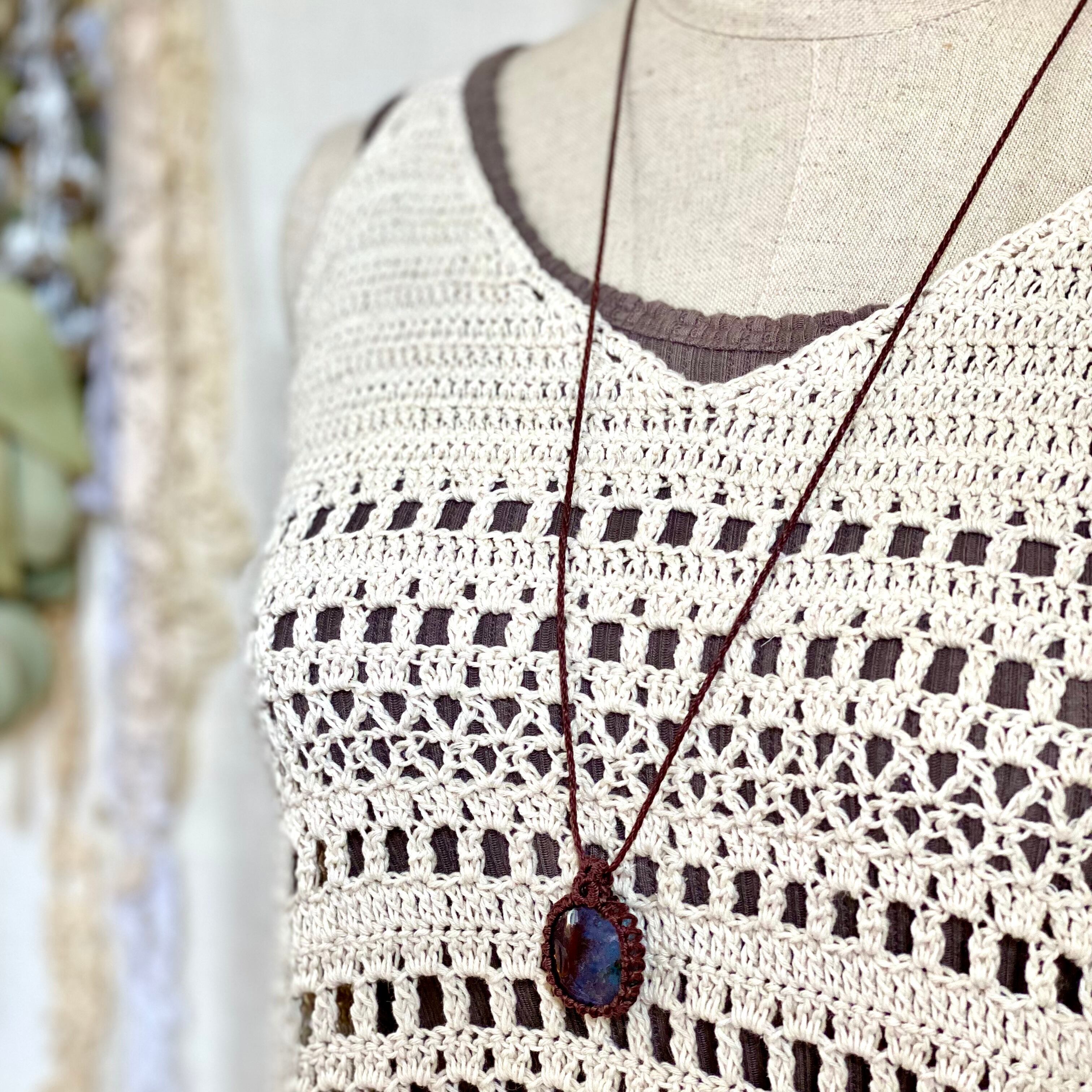 ダークブラウンの糸でシンプルフレームを作り、ポイントでバチカンにガーネットを、エンドにインクルージョンクオーツで仕上げました。