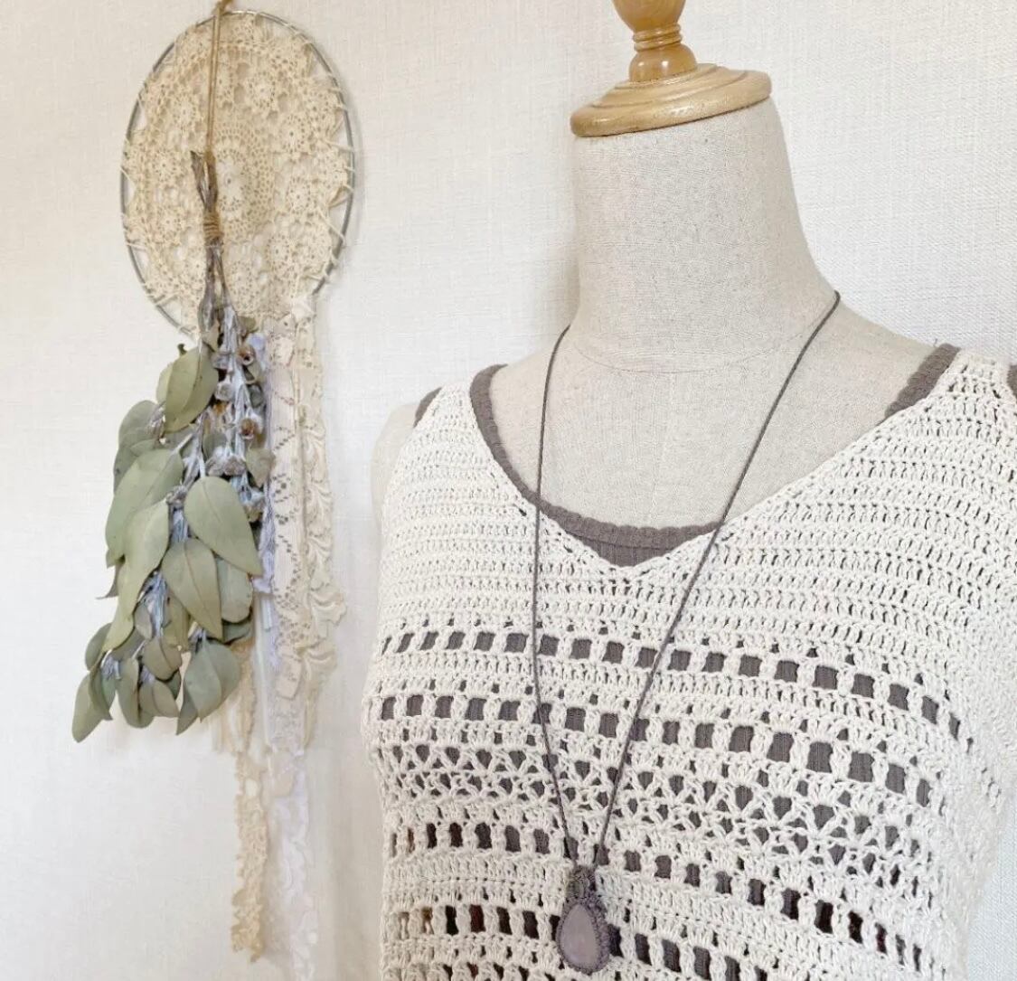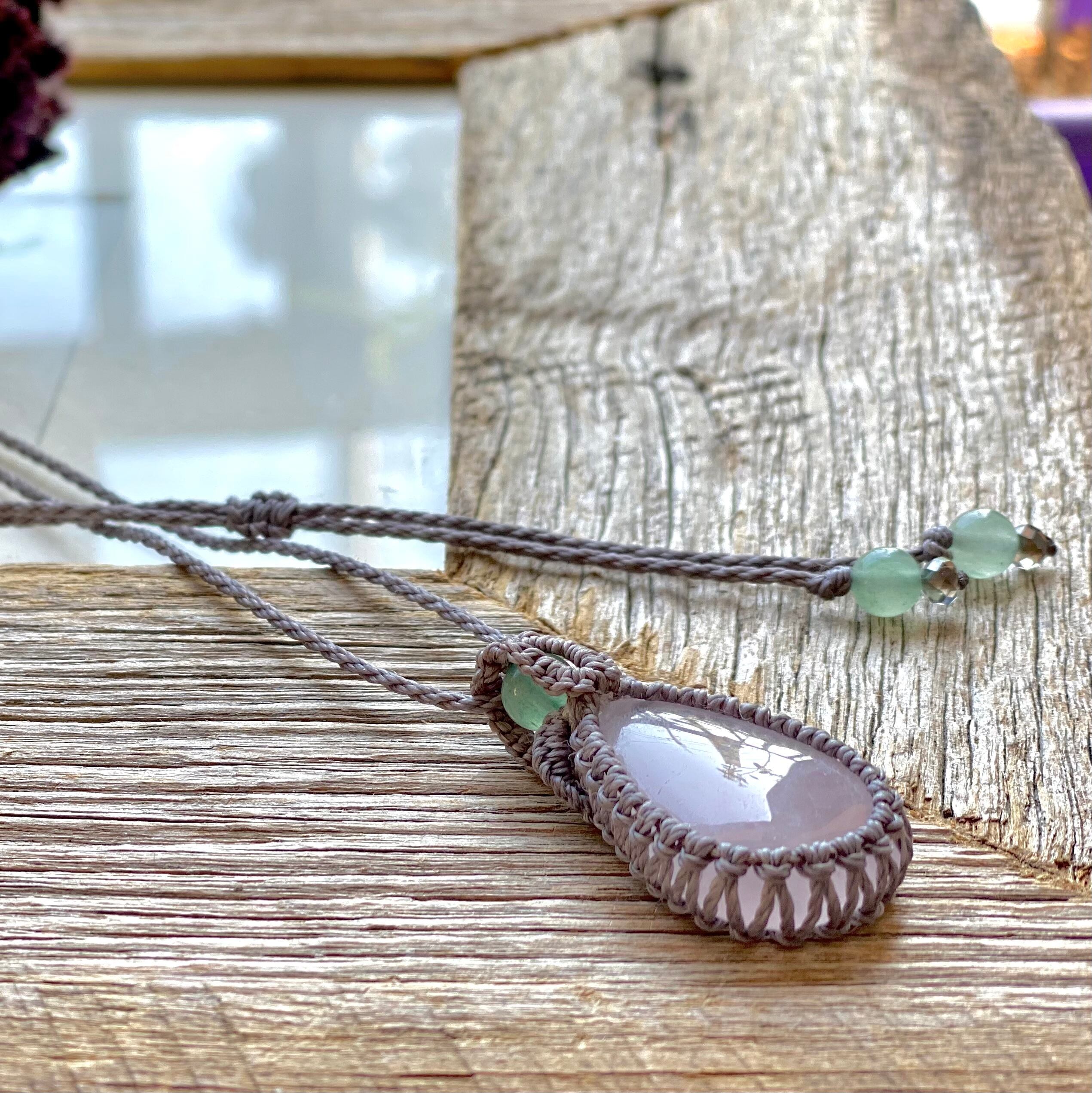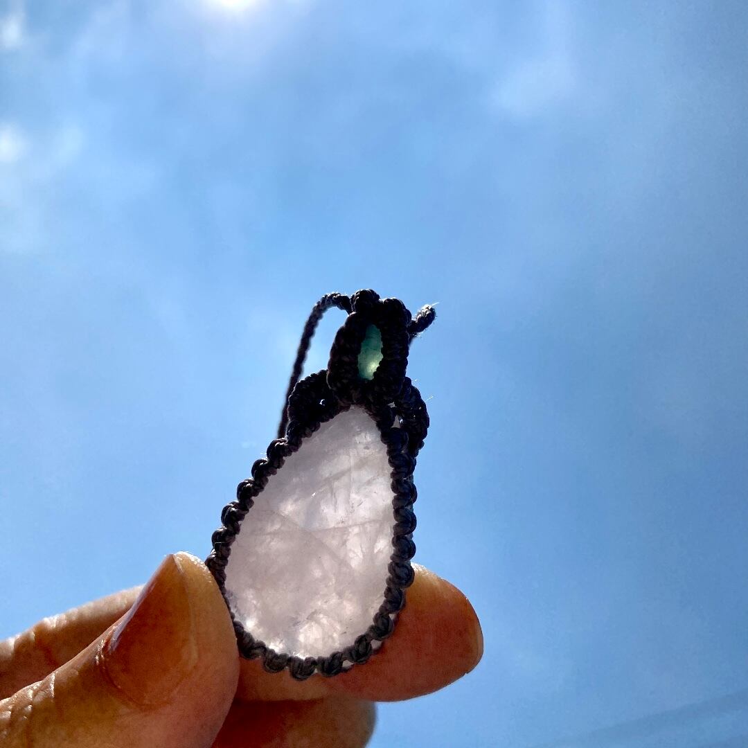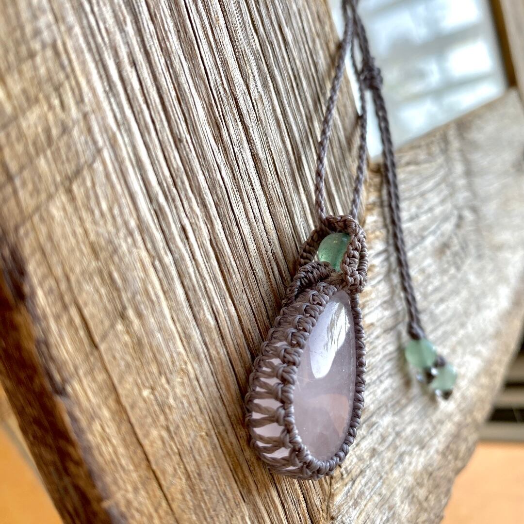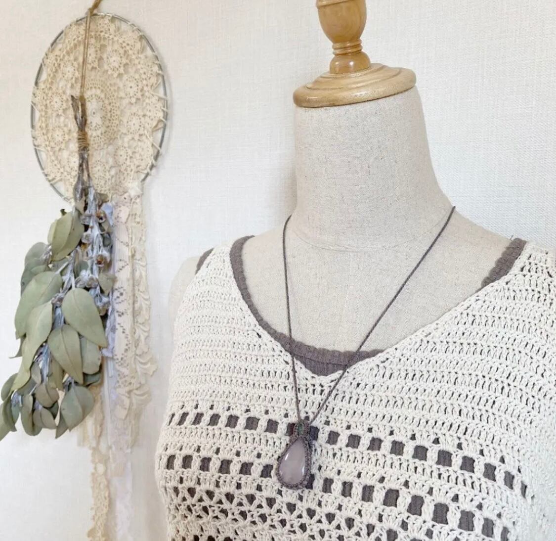 ピュアで優しい色合いのローズクオーツをライトグレーの糸で透け感あるフレームを作り、トップに軽いデザインをつけ爽やかでちょっぴり華やかな印象に。程よい存在感もあります。