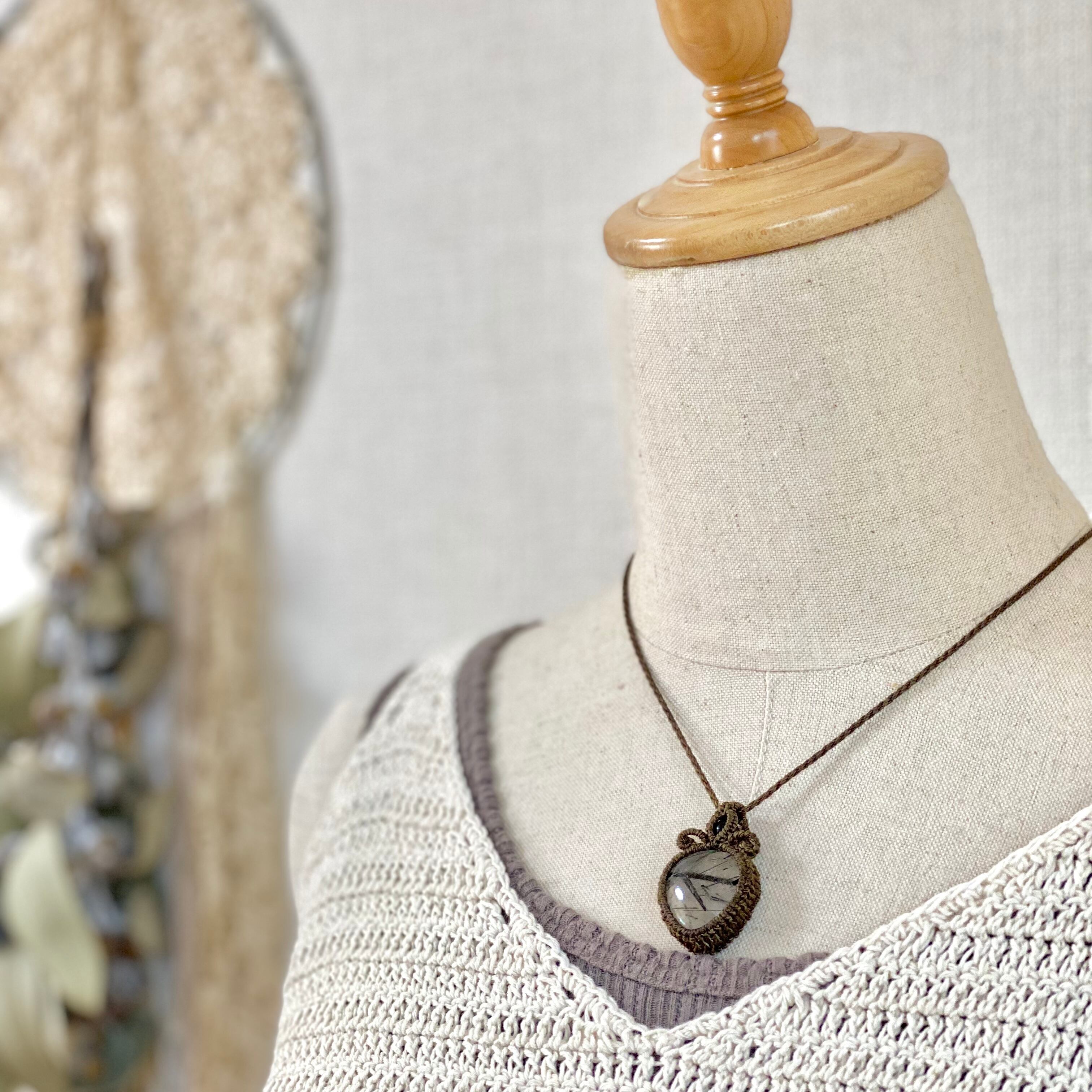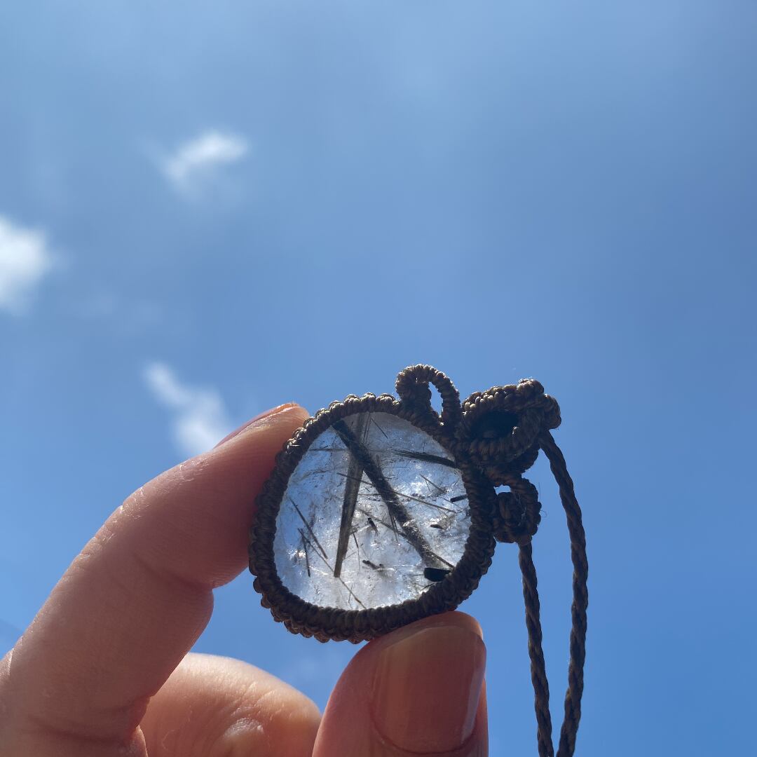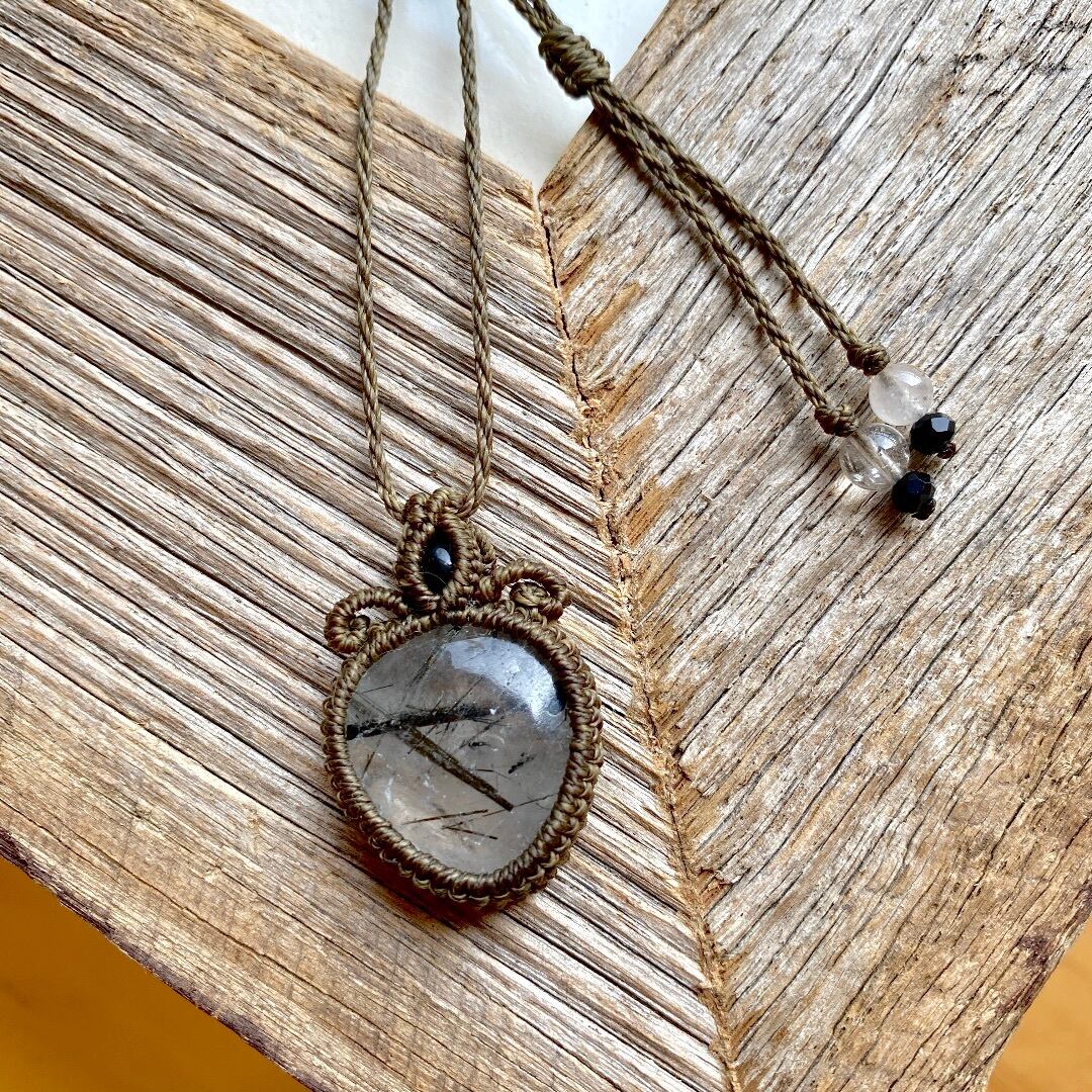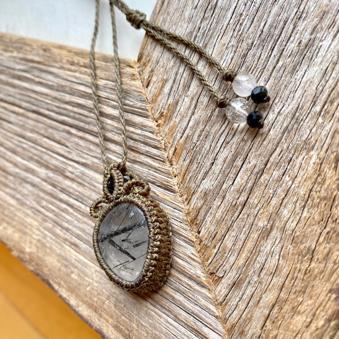 勝利☆ブラック トルマリン イン クオーツ 天然石マクラメネックレス/お守りジュエリー