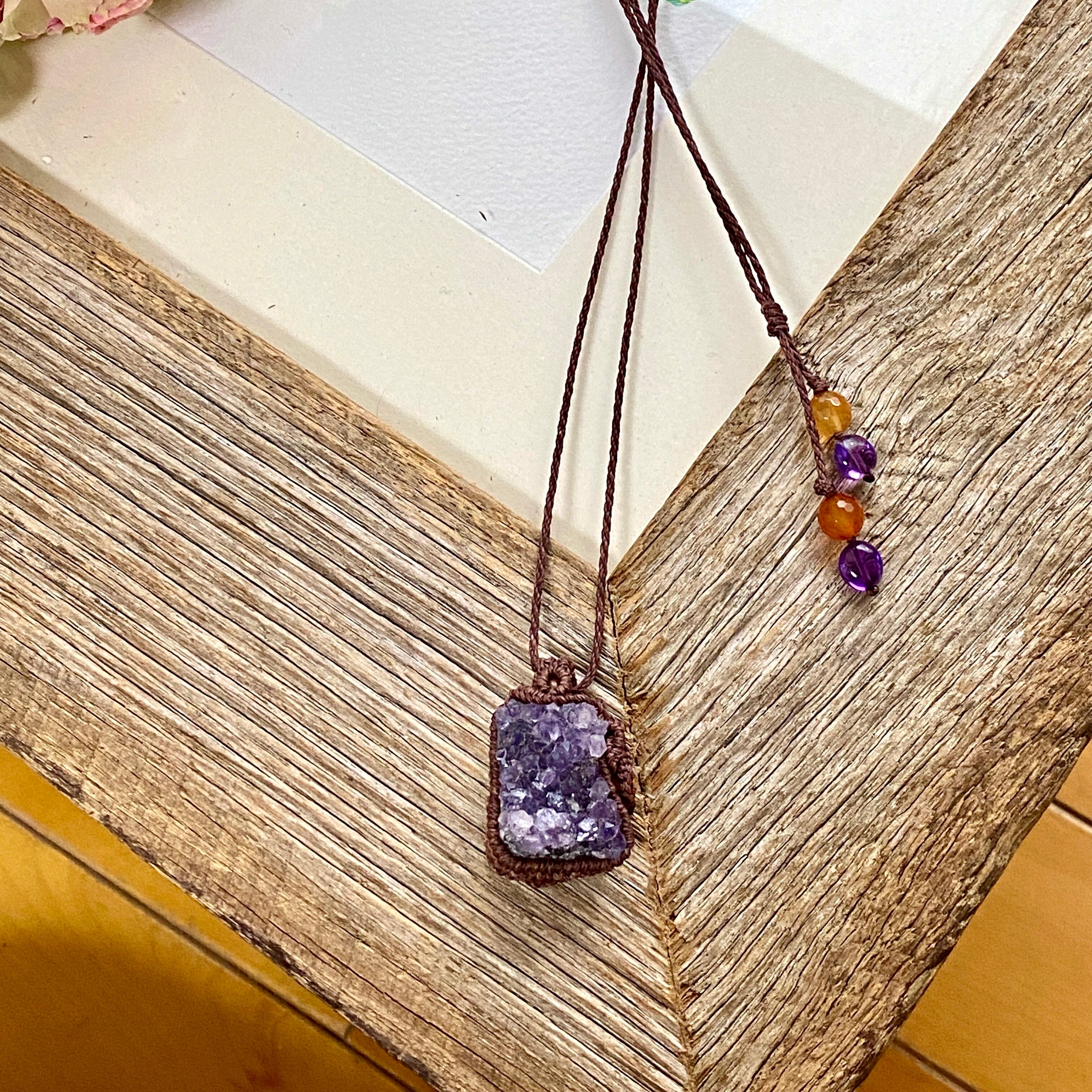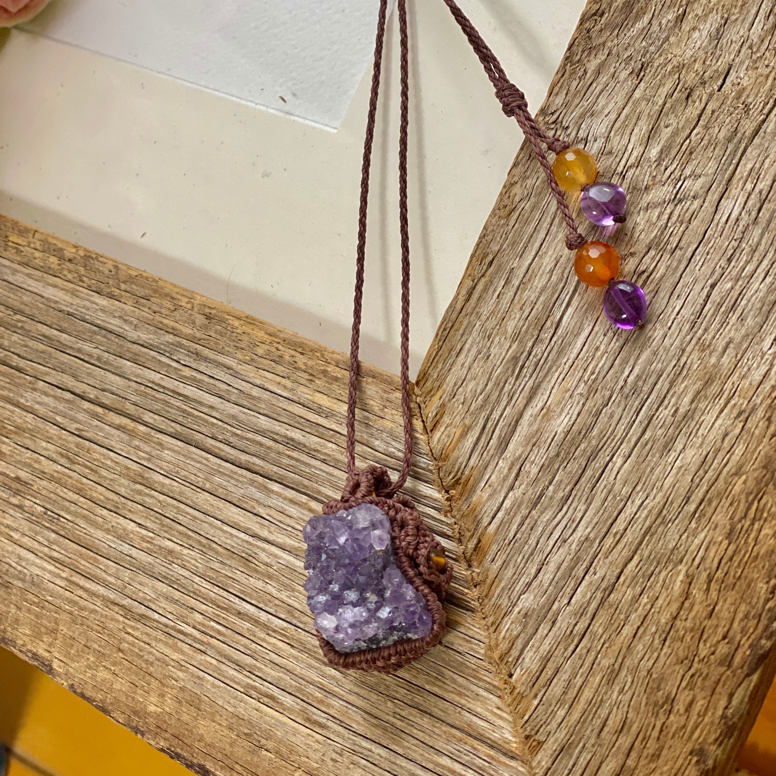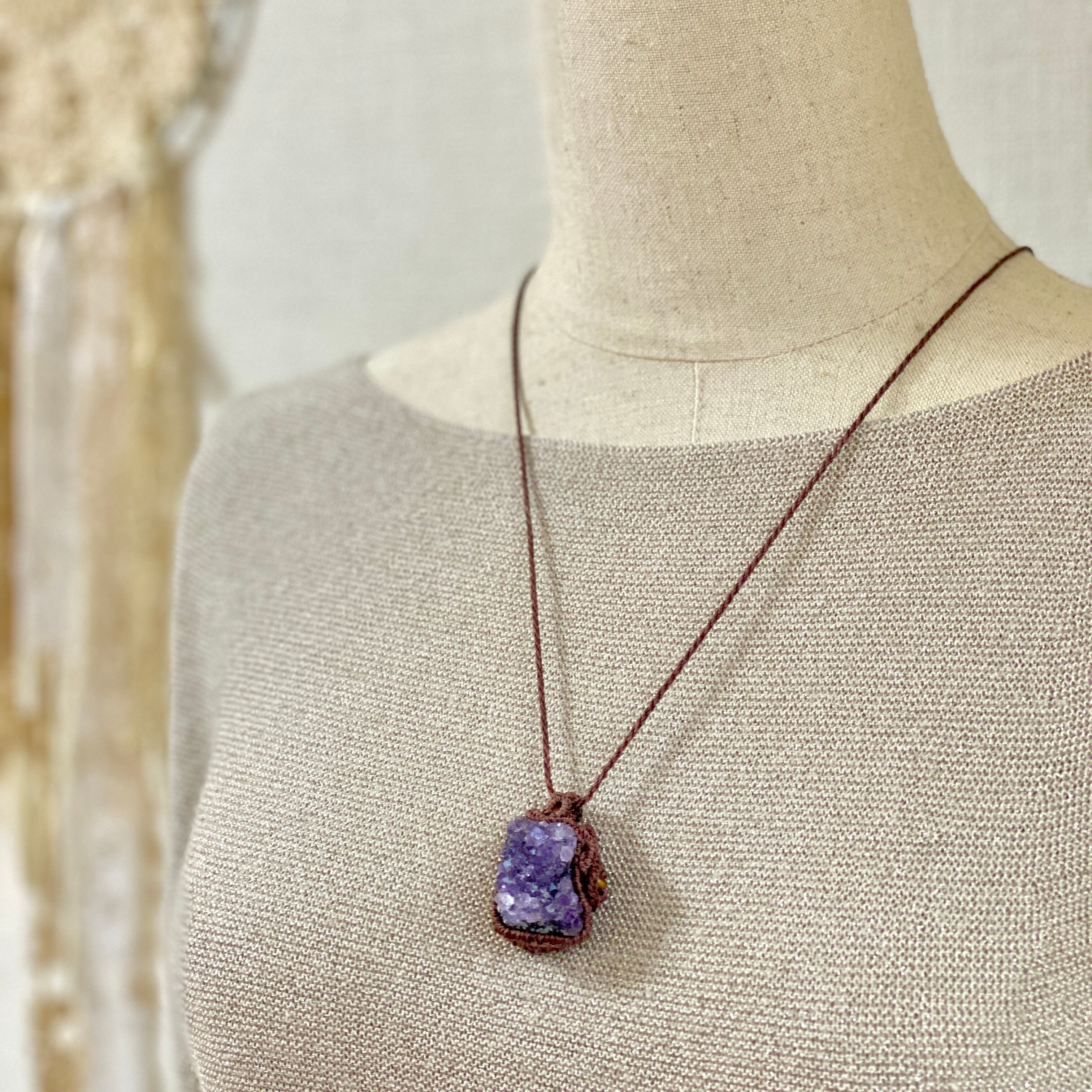 オリジナルで天然石アメジストクラスターをマクラメ編みのネックレスにしました。