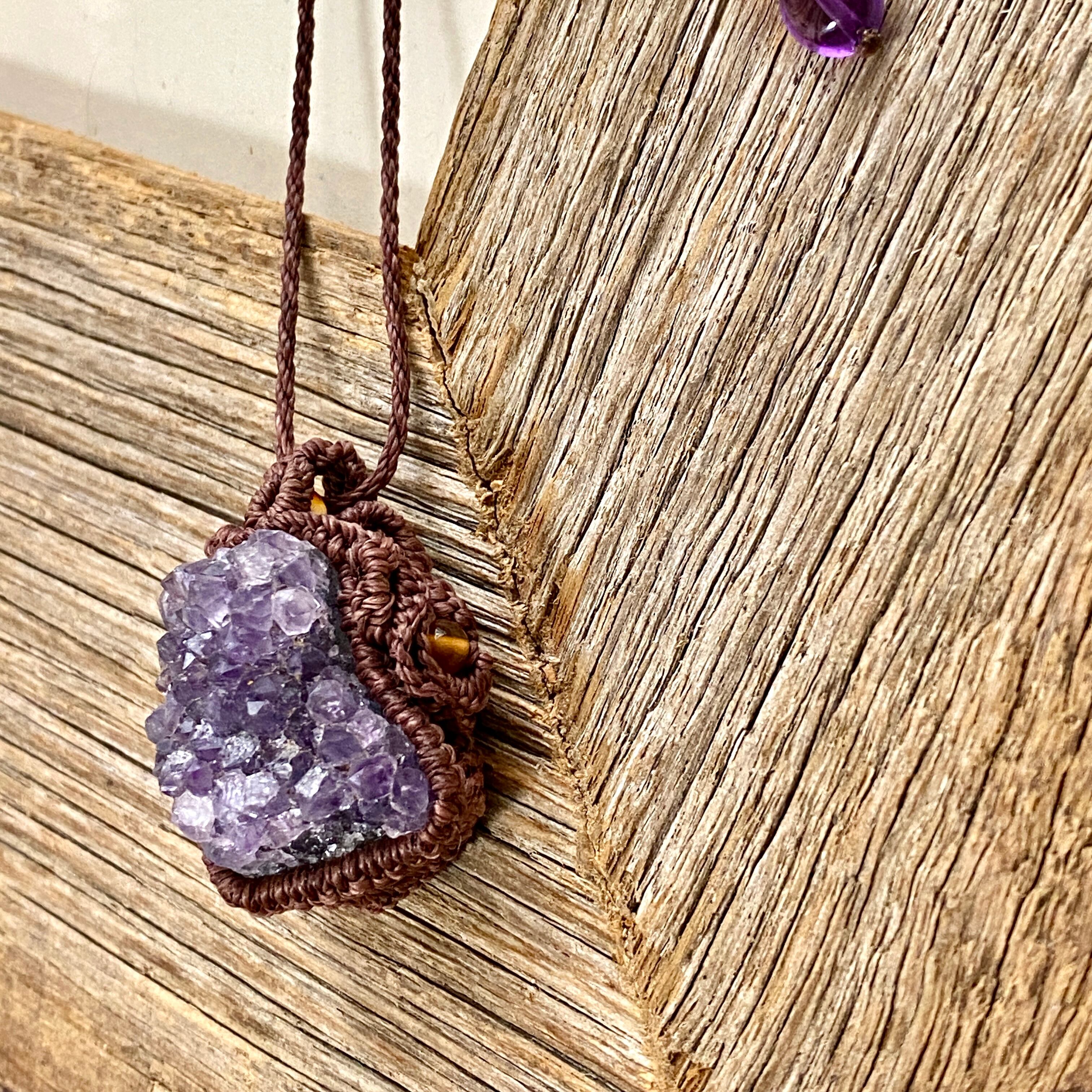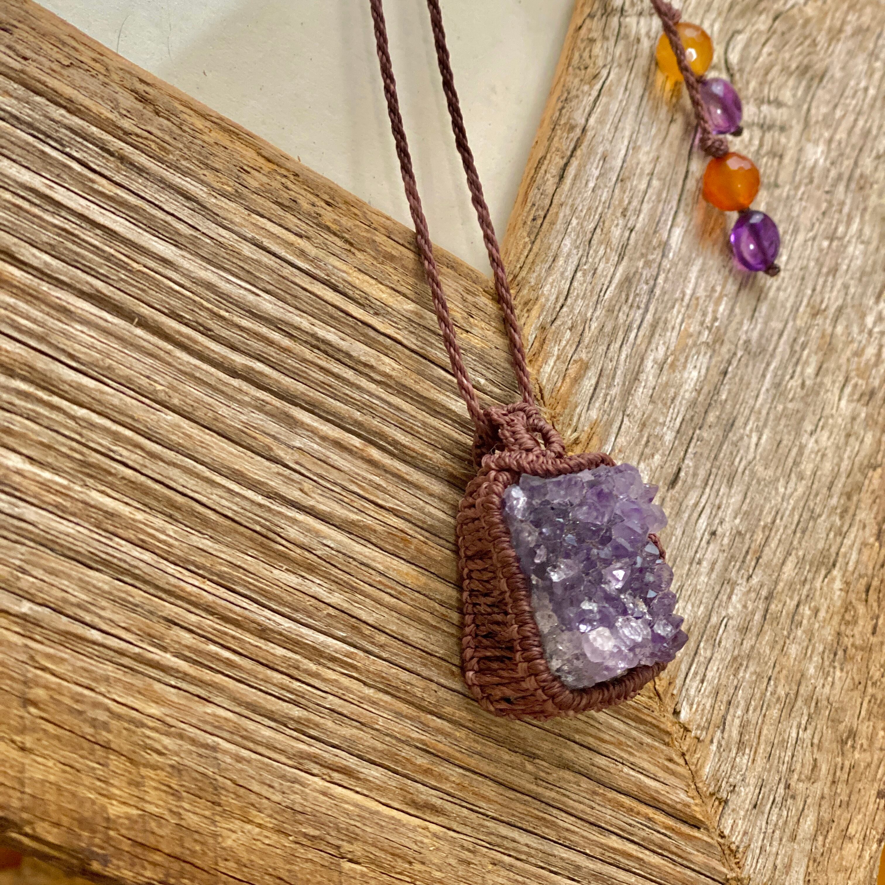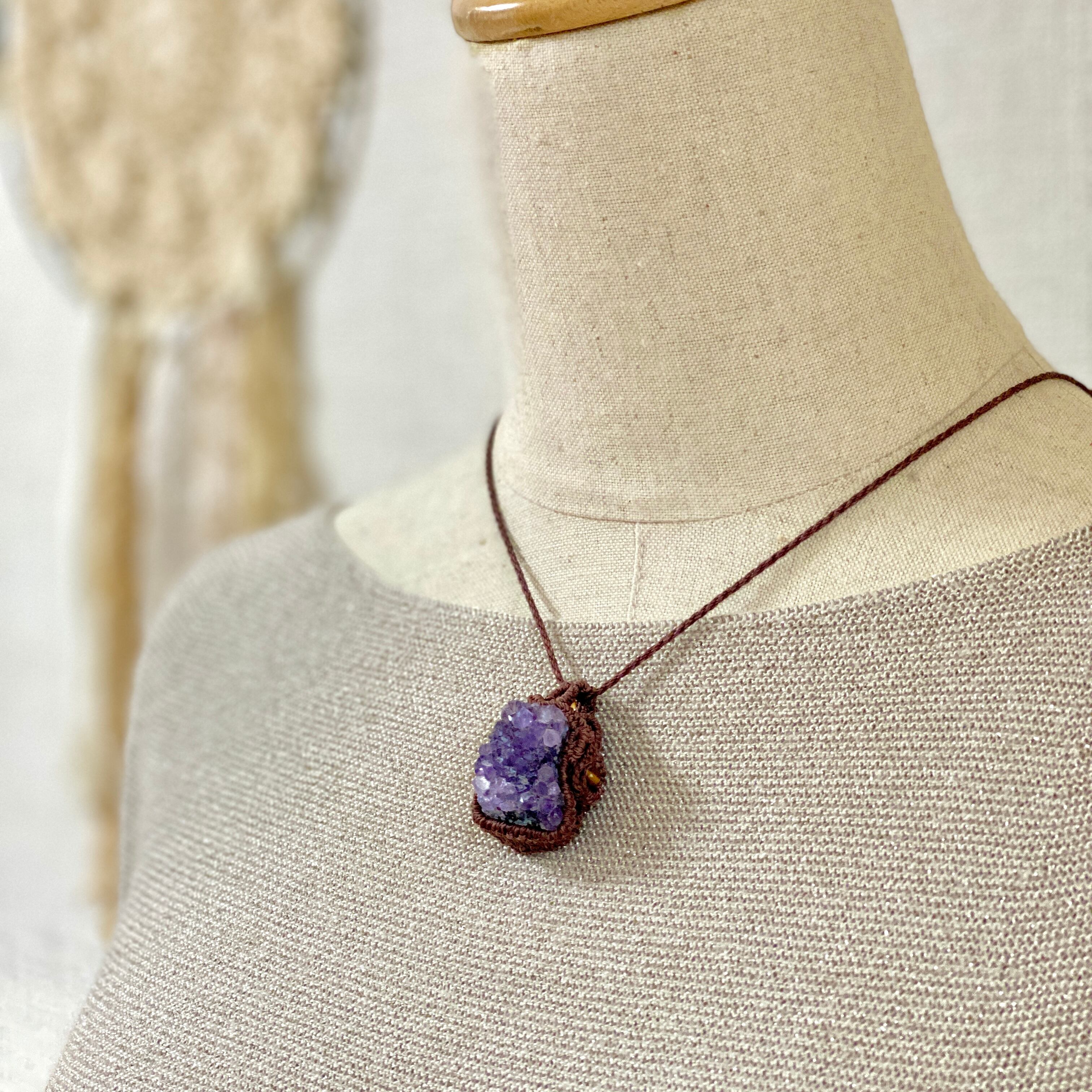 オリジナルで天然石アメジストクラスターをマクラメ編みのネックレスにしました。