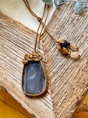 モンタナアゲートの美しいカラーが、装いを華やかに演出してくれます。また、マクラメ編みの繊細な手仕事によって、ボリューム感と高級感がある仕上がりとなっています。全長を自由に調整できるので、シンプルなトップスやドレスとも相性が良いです。