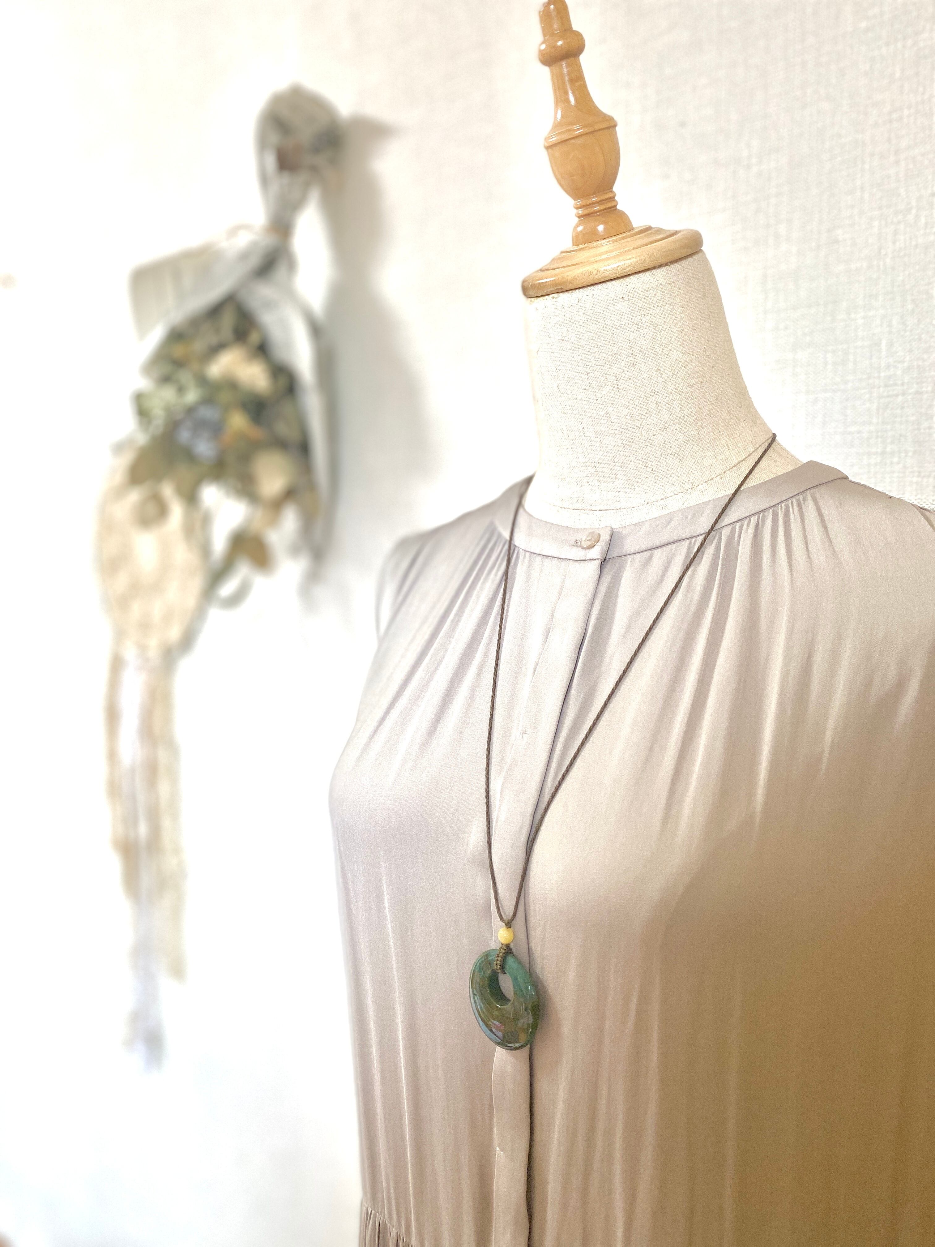 5色のディスク型天然石をシンプルなロングネックレスに仕上げました。