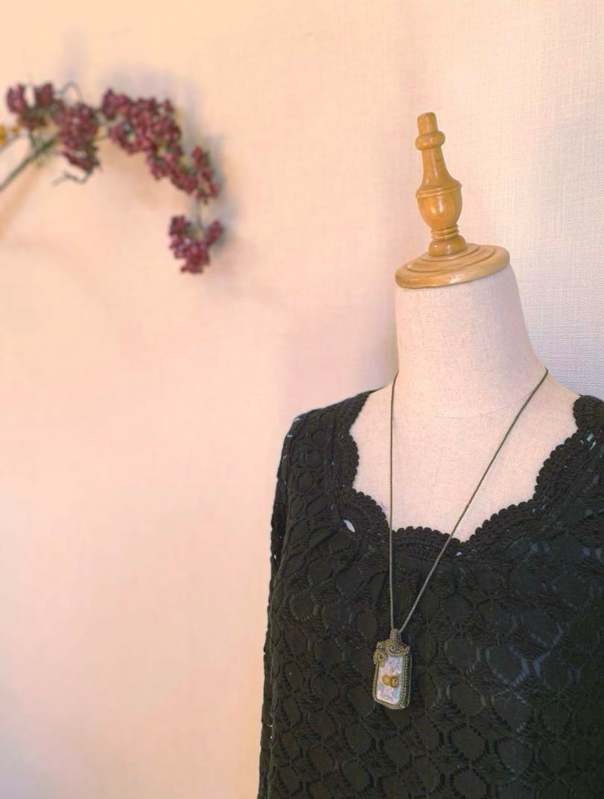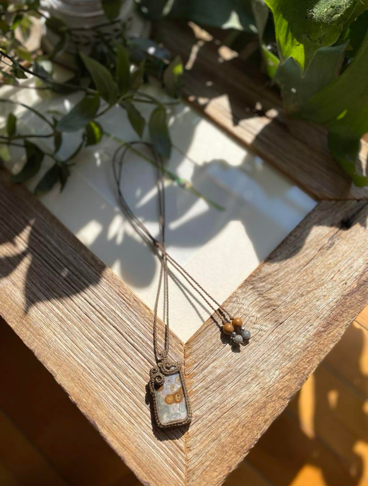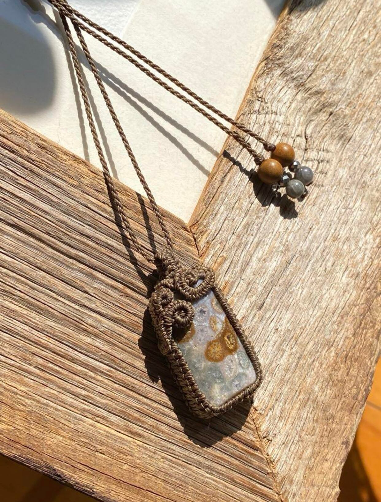 海の底に眠る神秘的なフォシルコーラルを使用した天然石のマクラメネックレスです。珊瑚の化石が、独特な模様とシックで落ち着いた色を生み出しています。軽くて丈夫なマクラメ編みは金属アレルギーフリー。日々のお守りとしてもご利用いただけるアクセサリーです。