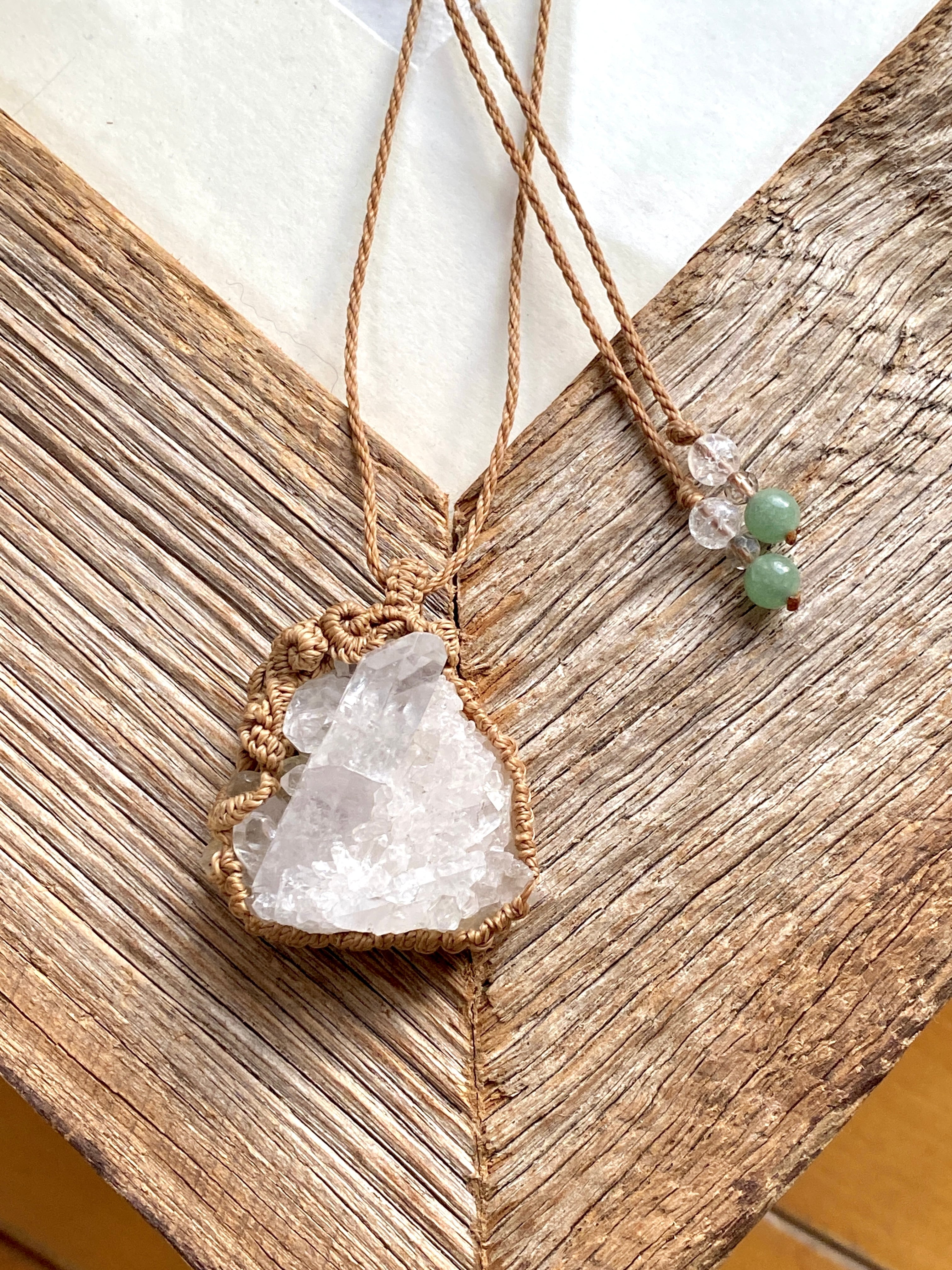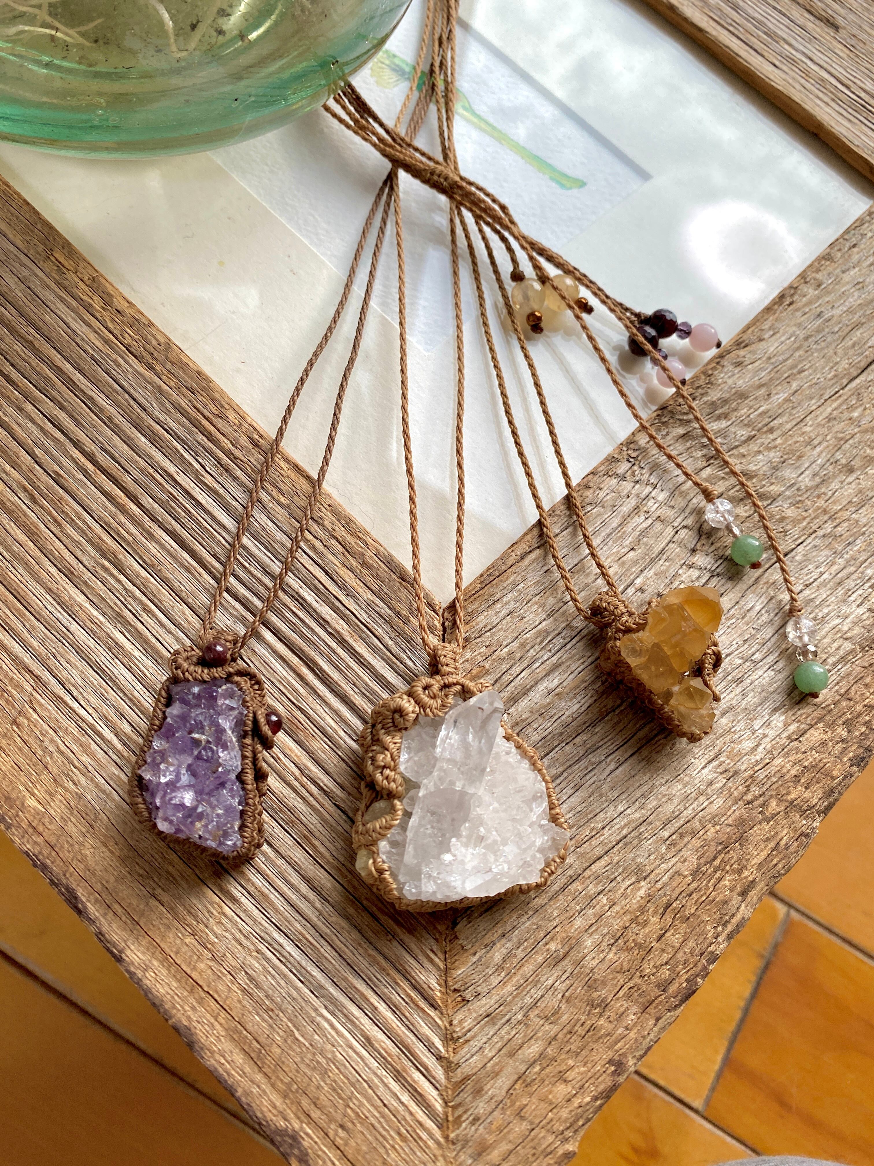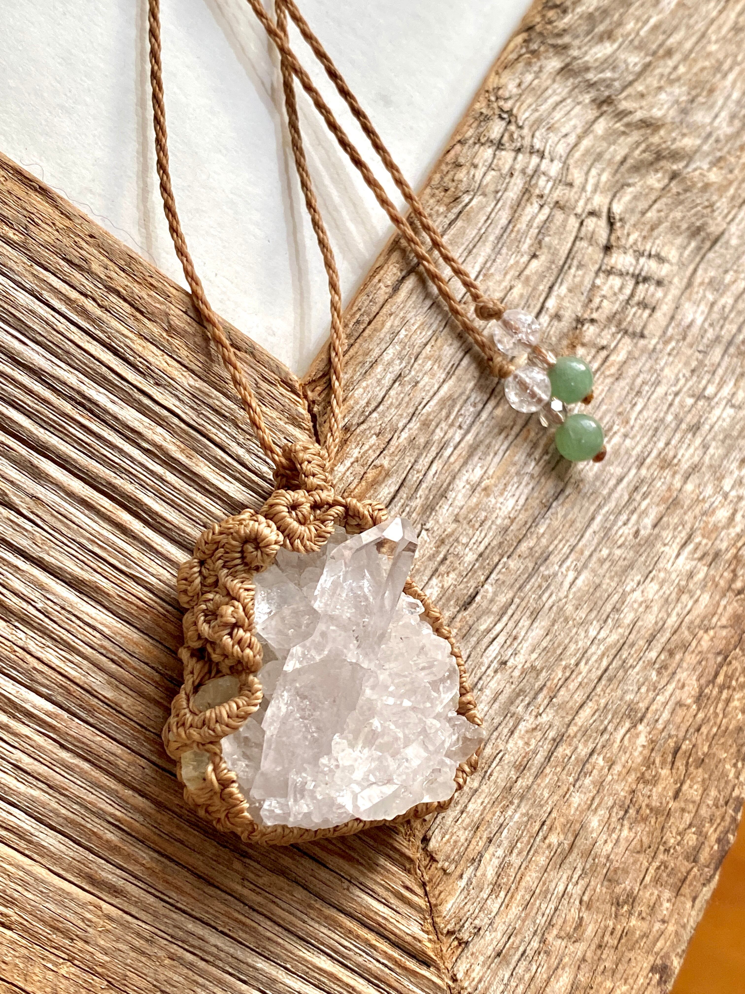 水晶クラスターをアカリヤオリジナルのマクラメ編みネックレスに仕上げました。
