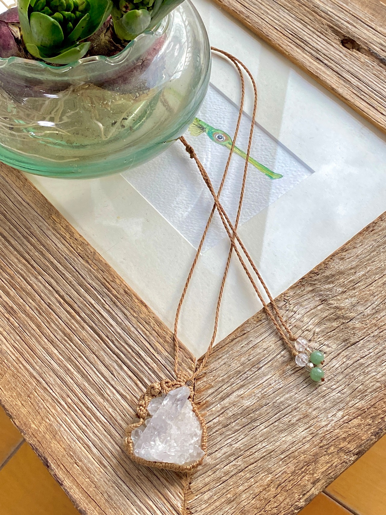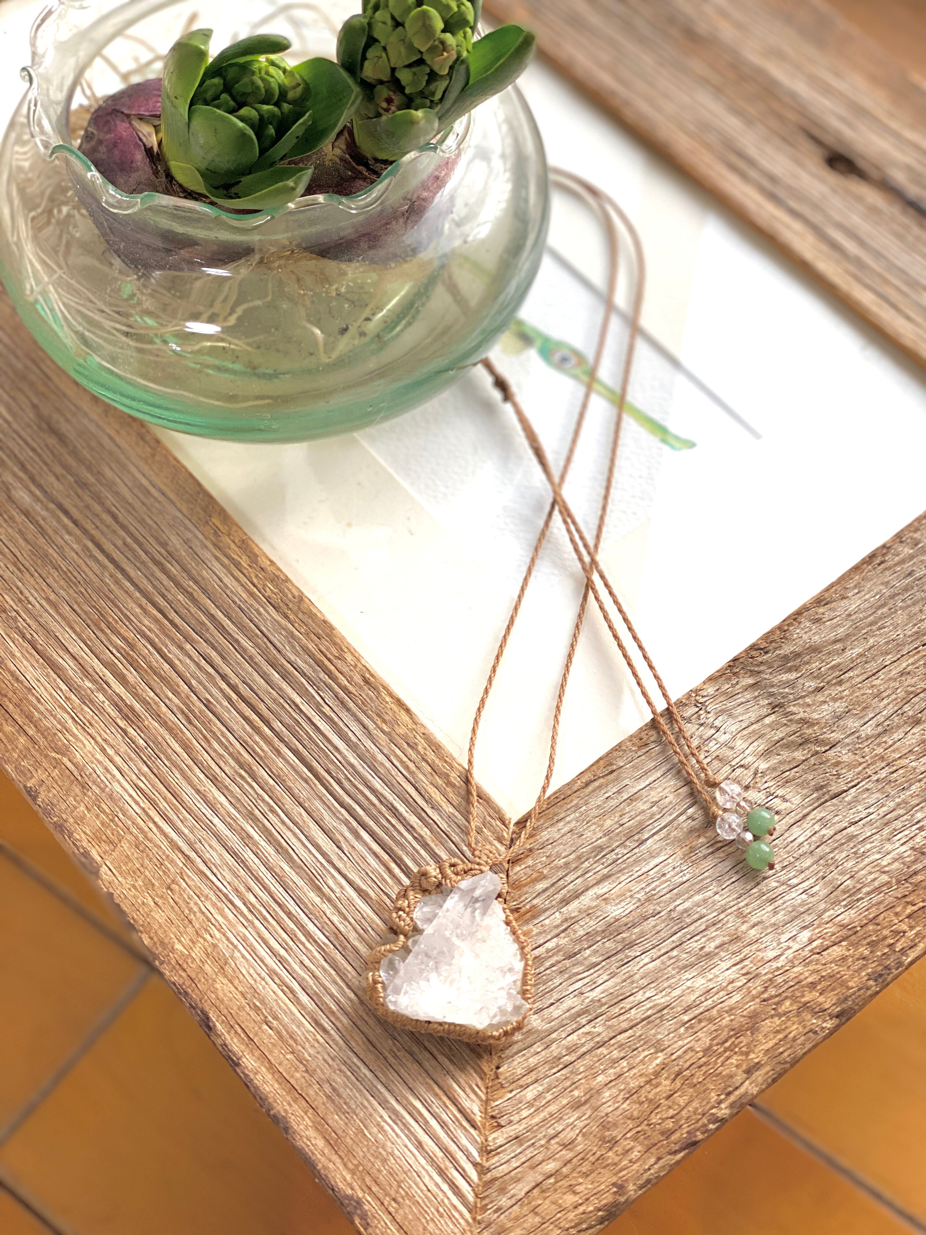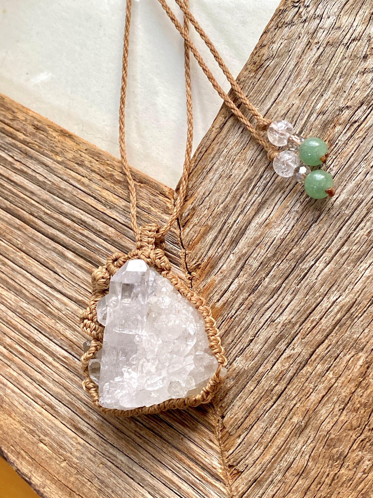 水晶クラスターをアカリヤオリジナルのマクラメ編みネックレスに仕上げました。